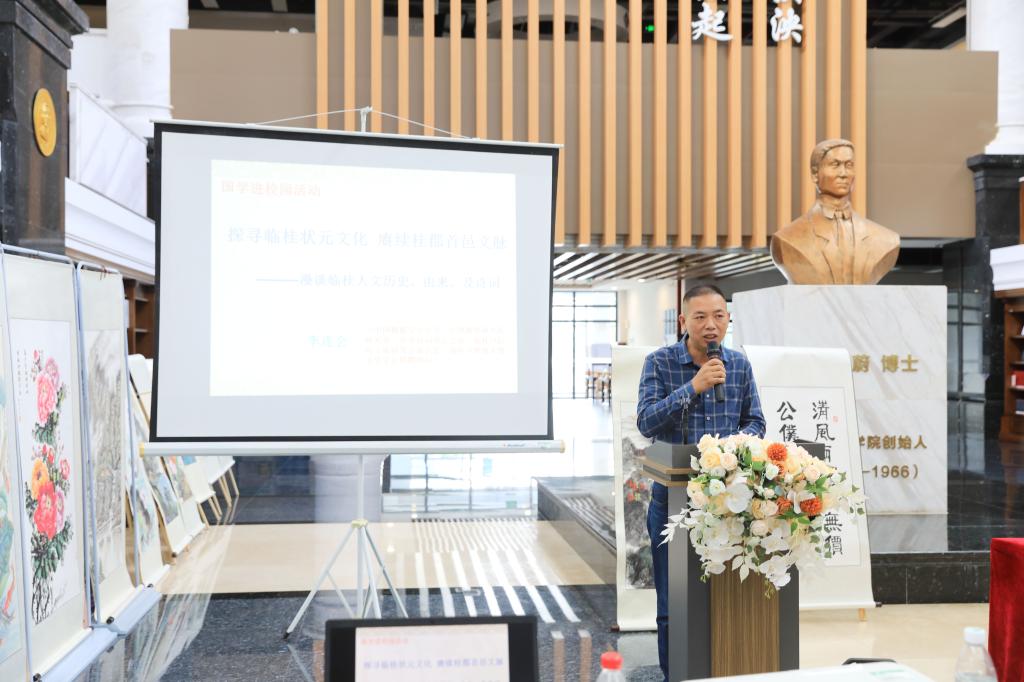 临桂区民间文化研究会常务副会长李连会结合史实,用讲故事的方式,为大家讲述了临桂的人文历史、由来及诗词文化。从“状元之乡”、“将军之乡”再到“冠军之乡”,陈宏谋、陈继昌、李天佑……数不尽的历史名人及刻在临桂人文基因里的清风傲骨、才情横溢、心怀家国,引起了师生们的强烈共鸣,现场不时发出啧啧赞叹和阵阵掌声。