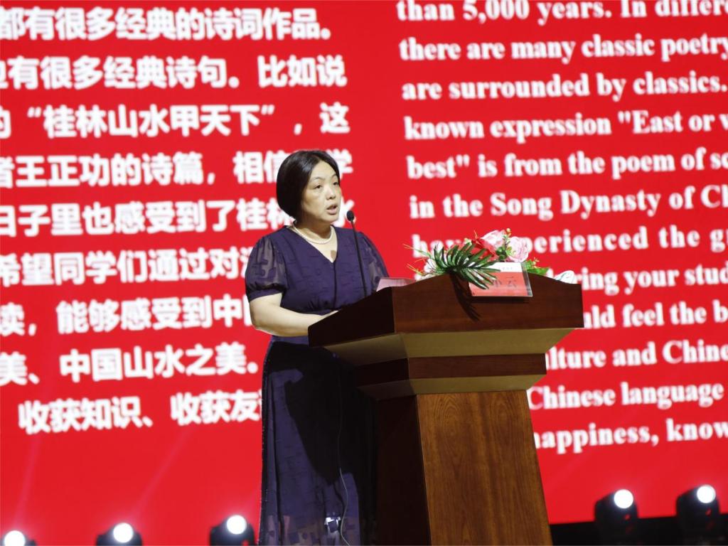 曾小云致辞。她对活动的顺利举办表示祝贺,对学生寄予温馨祝福,鼓励全体来华留学生学好汉语、在桂林山水极致之美中感受中华经典的魅力,嘱托毕业生在未来的工作学习上不忘“弘德善医”校训,发挥好国际交流合作的桥梁和纽带作用。