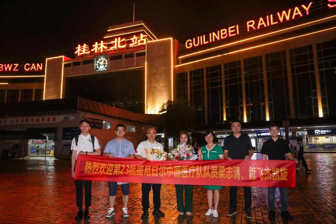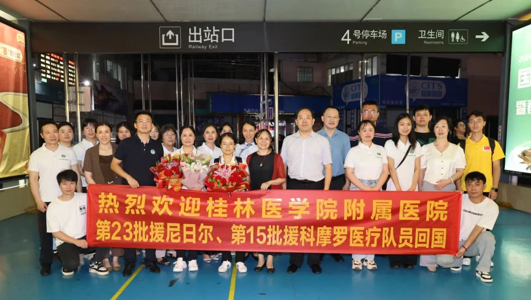 6月16日晚,我校参加中国(广西)第23批援尼日尔医疗队的全科医学院副院长、主任医师梁志清教授,第二附属医院麻醉科副主任医师管飞杰,附属医院消毒供应中心护士长、手术室副护士长王开秀,参加中国(广西)第15批援科摩罗医疗队的全科医疗科副主任医师卢文君博士等4名援非医疗队员在圆满完成了为期18个月的援非医疗任务后,载誉归来。