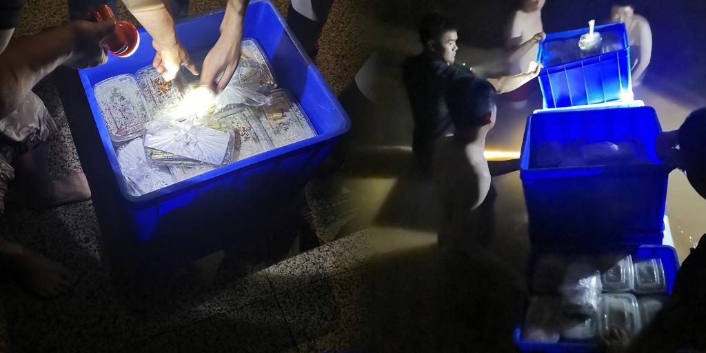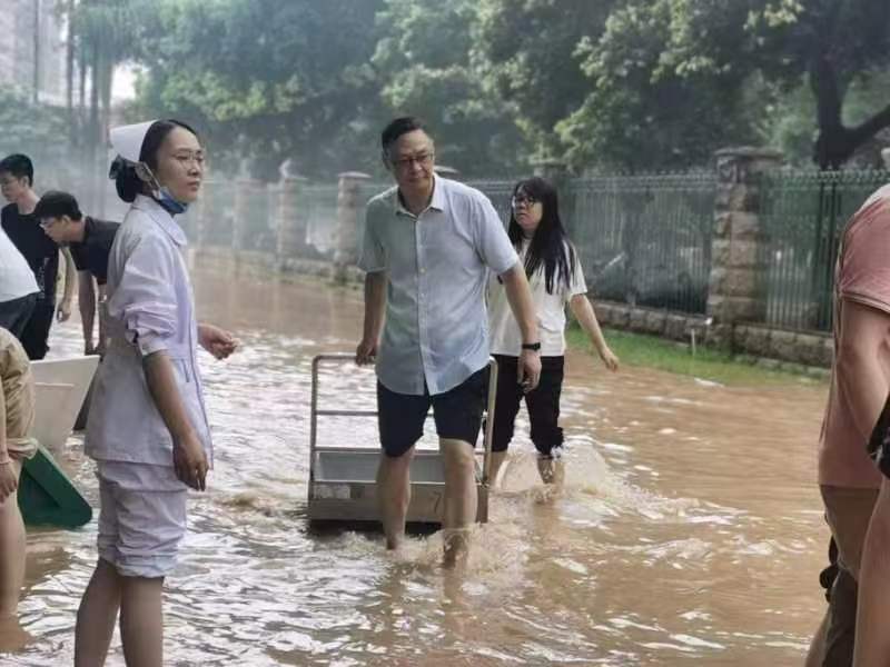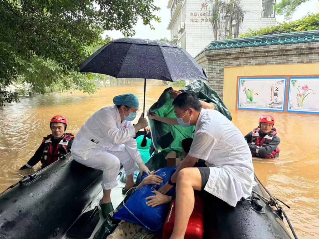 与此同时,附属医院医护人员不畏洪水,为守护人民健康展开了生命救援。19日中午,附属医院急诊科收到120呼叫,一名长期在家使用制氧机氧疗的91岁老年慢阻肺患者,因洪灾停电后,出现呼吸急促等缺氧症状,急需医疗救助。附属医院急诊科余文军医师和蒋艺护士迅速赶往现场。由于市区内多处道路被洪水阻断,而老人所在区域是较早受灾的区域之一,救护车行驶到七星公园附近时,因积水严重无法继续通行。时间就是生命,余文军立刻联系119消防救援人员寻求帮助。消防队迅速调来了橡皮艇,载着余文军和蒋艺及抢救设备在雨中冒险前进,到达患者家中时,患者已呼吸急促,指脉氧仅75%,口唇已有紫绀缺氧表现,医护人员迅速给予积极氧疗和短暂呼吸支持救治。在消防救援人员和医护人员的合作下,患者被顺利移送至橡皮艇上,风雨中,生命的小舟在医护和消防救援人员的守护下坚定前行……目前,患者在附属医院得到进一步救治。