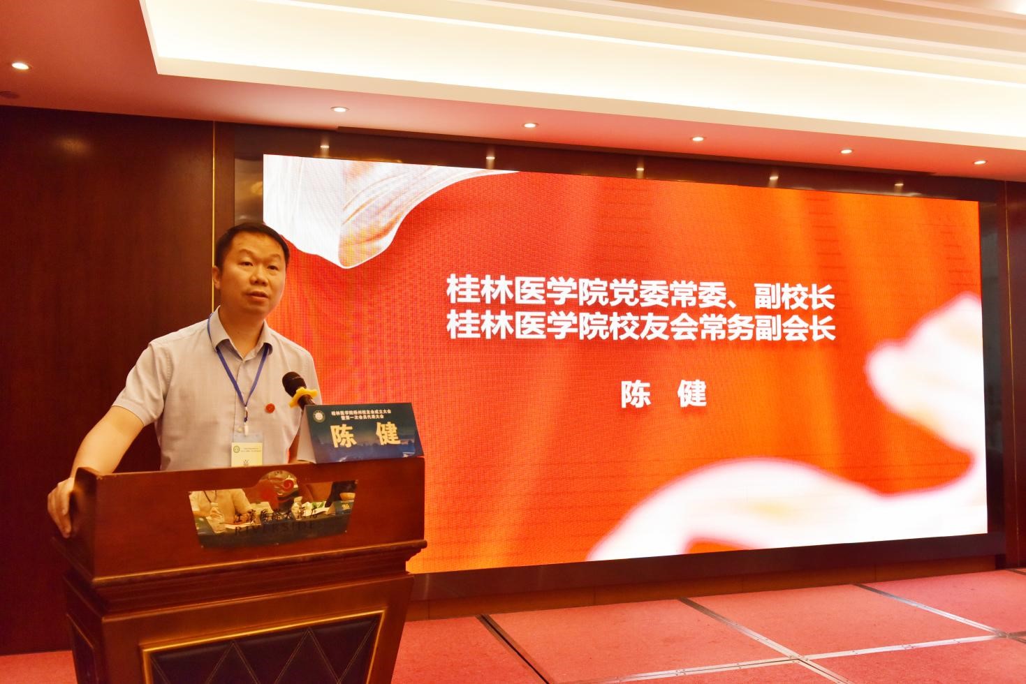 陈健对梧州校友会的成立致以热烈的祝贺以及梧州地区的校友们致以诚挚的祝福。他表示,在近90年的岁月更迭中,数代桂医人用汗水和智慧,谱写出了桂林医学院改革发展的华彩篇章。梧州校友在梧州卫健及药监行政管理部门、医疗卫生机构、医药企业等领域砥砺深耕,为母校赢得了良好的声誉。他希望大家以校友会为纽带,密切母校与校友的情感联结;以校友活动为抓手,全面汇聚校友的智慧力量;以90周年校庆为契机,协同助推学校高质量发展。他期冀广大校友永葆桂医人的精神底色,也希望广大校友一如既往关心、支持母校建设。他诚挚邀请每一位校友参与到母校90周年校庆中来,相约2025年,共同分享桂医90华诞喜悦,共同创造桂医人的灿烂明天!