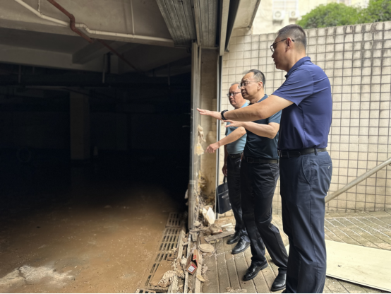 韦政权一行在东城校区弘德楼地下车库察看洪水过后受损情况