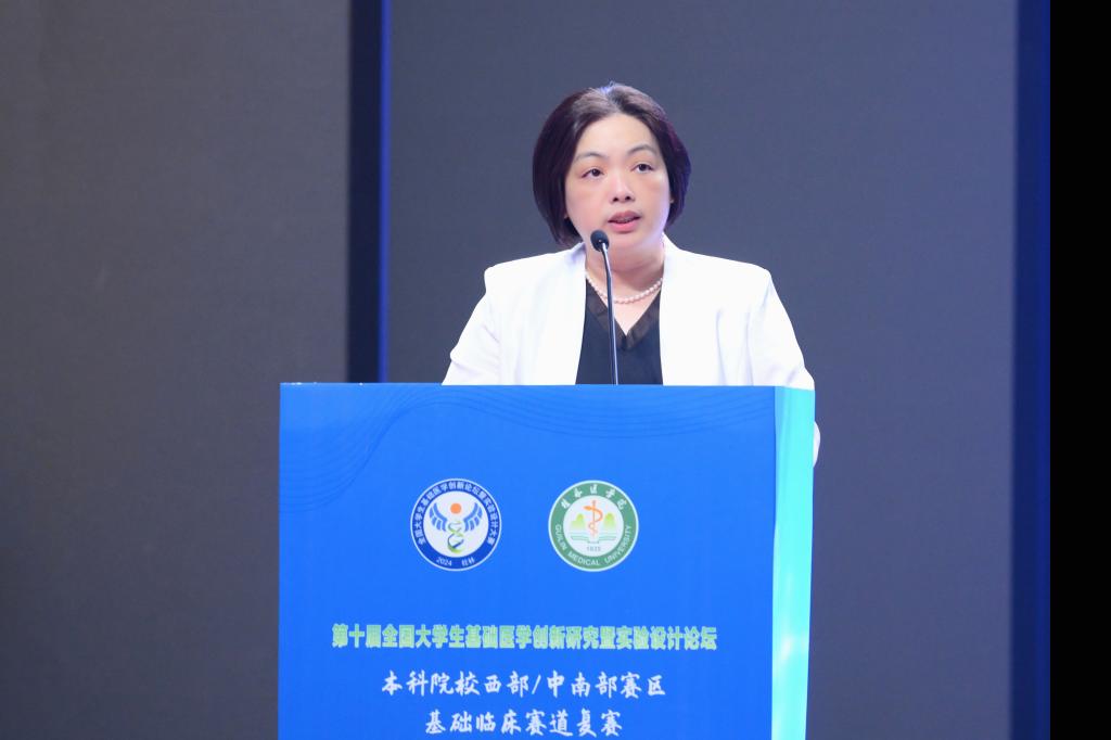 曾小云对出席论坛的各位领导、嘉宾和参赛师生表示热烈欢迎,对长期关心、支持桂林医学院事业发展的高等学校基础医学创新创业协同育人工作组以及各兄弟院校表示衷心感谢。她介绍了桂林医学院的发展历程、建设成效及未来规划。她表示,近年来,桂林医学院抓住国家实施科教兴国、人才强国战略的机遇,桂医特色办学品格日益突显,已形成本硕博完整的人才培养体系,成为地方医学教育、医疗卫生和健康服务产业的重要基地。此次复赛在桂林医学院举办,是学校响应新时代对新质生产力和新质人才培养的需求、助力健康中国建设的重要举措。希望以此次比赛为契机,汇聚资源、提升能力,共同谱写新时代基础医学教育发展新篇章,为实施健康中国战略、推动新时代卫生健康事业高质量发展、切实维护人民安全和健康贡献桂医智慧和力量。