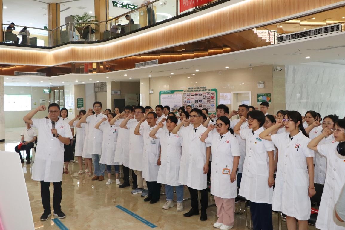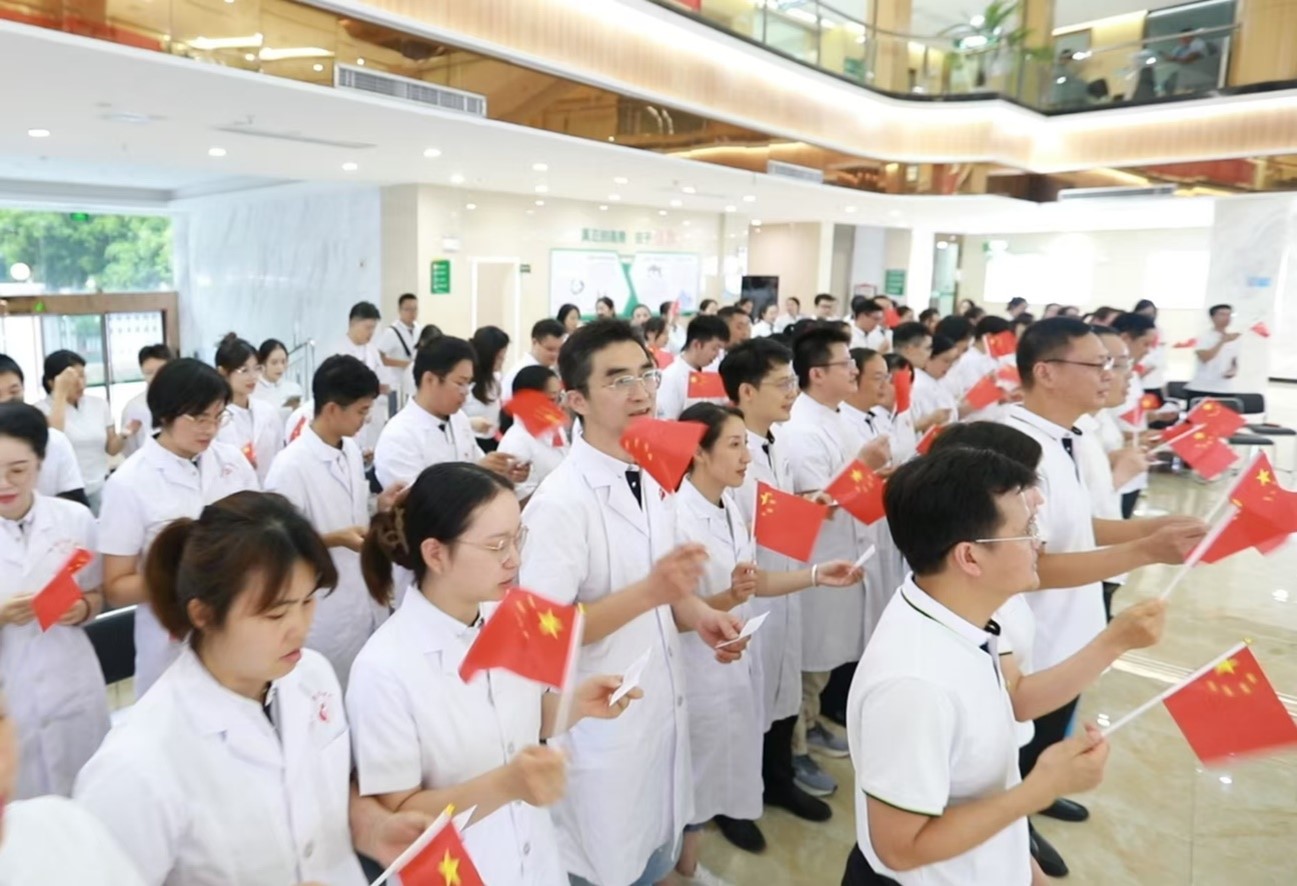 在医院党委副书记、院长的带领下,全体医师重温《中国医师宣言》,他们高举右手、紧握拳头,庄严宣誓。六十九个字五句话,字字扣心、句句千钧。铿锵有力的宣誓声响彻门诊大厅。