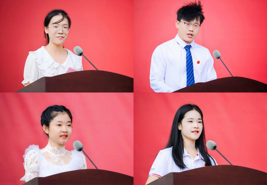 本科新生代表黄意婷同学、博士研究生代表陈冠君同学、来华留学生代表彭素妮同学、在校生代表黄佩淇同学及教师代表宋家乐教授作为师生代表先后上台发言。他们以自身经历,分享了对医学生使命和担当的理解,对桂医的感受和对大学的感悟,并表示将勇担护佑人民健康的重任,做新时代医疗卫生工作者,为全面建成社会主义现代化强国贡献青春力量。