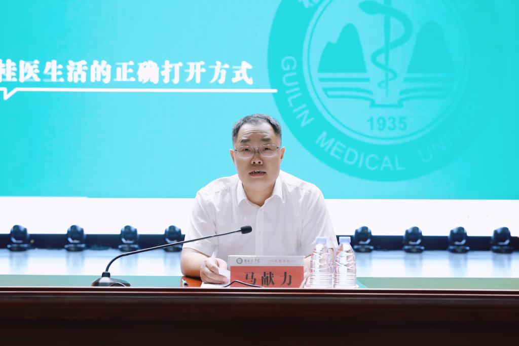 马献力就如何做一名敢担当有作为的新时代医学生提出了五点希望。一是坚持理想,胸怀天下,矢志维护人民健康;二是追求卓越,锐意创新,勇攀医学科学高峰;三是崇尚人文,护佑生命,践行医者仁爱之心;四是团结合作,携手并肩,共同守护人类健康;五是向阳而生,向善而行,积极传递青春动能。他勉励同学们传承弘德善医校训精神,跑好堪当民族复兴大任的桂医青年接力棒,用激情和奋斗挥洒最美的青春,为国家的医疗卫生事业和科技进步接续奋斗!