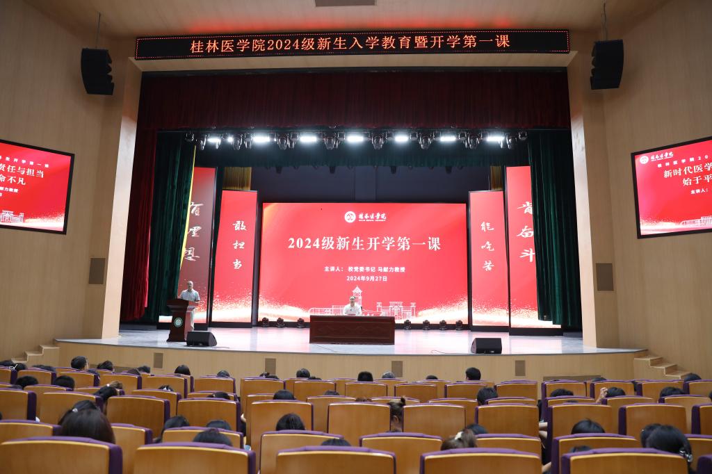 9月27日晚,学校党委书记马献力以“始于平凡,使命不凡——新时代医学生的责任与担当”为题,在艺术中心为2024级新生讲授“开学第一课”。800余名2024级新生,相关职能部门负责人、各二级学院学生工作负责人、新生辅导员在会场集体听课。“开学第一课”开通网络直播,未到现场的新生在线同步学习。