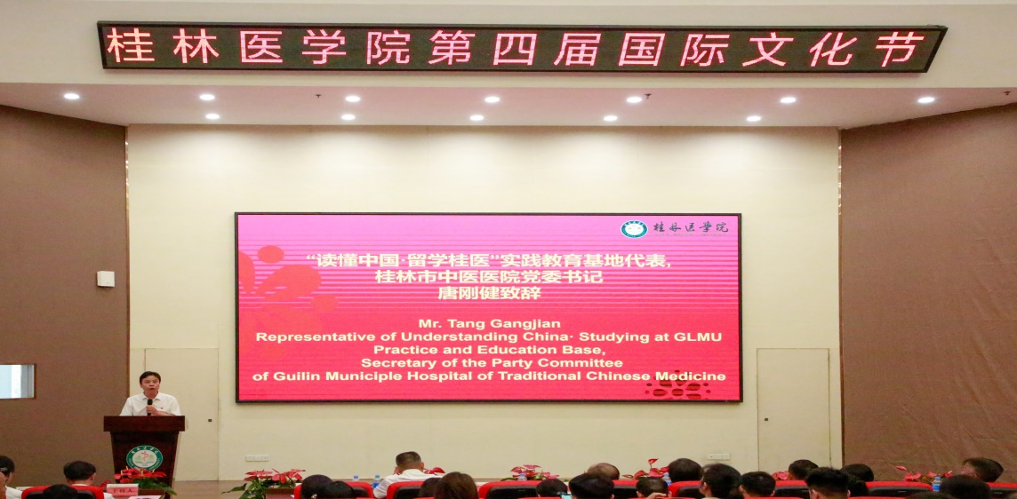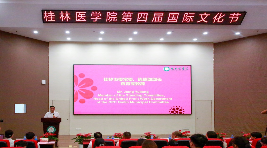 蒋育亮致辞,他肯定了我校在文化育人、国际教育交流等方面所取得的成绩。他表示,将大力支持我校继续推进“读懂中国·留学桂医”品牌建设,持续促进我校国际教育高质量发展,为桂林加快打造世界级旅游城市,以及推动世界医学教育和医疗卫生事业高质量发展作贡献。