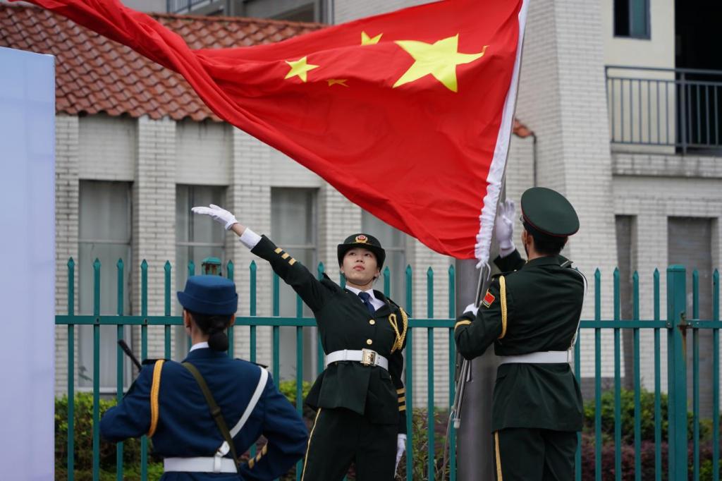 为庆祝中华人民共和国成立75周年,激发师生爱国情感,营造隆重、热烈、祥和的节日氛围。10月1日上午8时,我校在临桂校区举行国庆升国旗仪式。1000余名师生参加了升旗仪式,师生代表整齐列队,国旗护卫队迈着矫健的步伐护旗入场。
