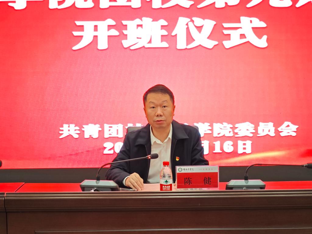 陈健作开班动员讲话,他要求团校学员珍惜机会、认真学习,并向学员提出三点希望:一是要坚定理想信念,深学细悟党的创新理论,争做有志的桂医青年;二是要立志勤奋学习,发挥先锋模范作用,争做有识的桂医青年;三是要牢记“国之大者”,投身中国式现代化建设,争做有为的桂医青年。陈健以《医路荆棘、热辣滚烫——医学生的职业认知》为题进行授课,他从医学专业认知、医学职业规划及医学情怀三个方面,鼓励学员要始终将医学事业作为自己的使命和责任,努力实现自我价值。