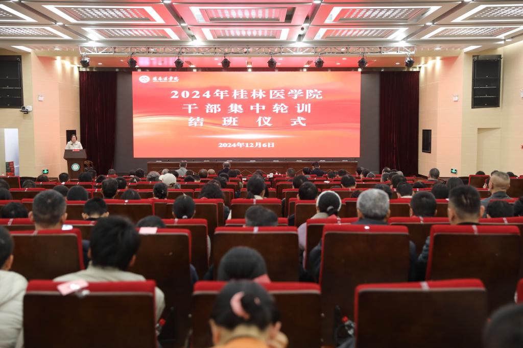 为全面贯彻党的二十大和二十届二中、三中全会精神,深入学习领会自治区党委十二届八次全会精神,以改革创新助推学校事业高质量发展,激发师生员工干事创业的主动性和创造性,近日,学校在临桂校区教学北楼多功能报告厅举办2024年干部专题培训班,并于12月6日上午举行结业仪式。全体校领导、全体中层干部、校本部科级干部、党务干部及直属附属医院中层干部850余人参加本次培训。