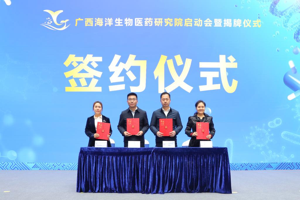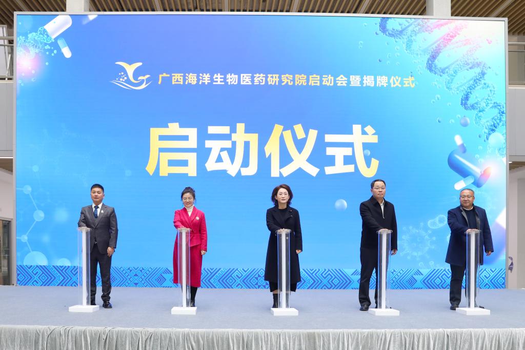 随后,黄江、马献力、姚作芳、姜明国、薛明杰共同为广西海洋生物医药研究院的“诞生”按下启动键。碧海无垠、科创兴海,相信在校企地三方的共同努力下,未来,广西海洋生物医药研究院将在防城港这座美丽的滨海城市熠熠生辉。