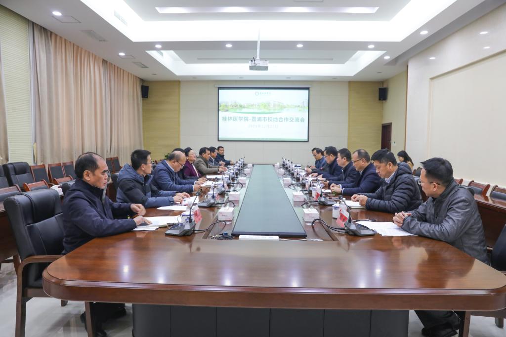 12月27日,荔浦市委书记李玉清率领荔浦市四家班子领导、市卫生健康局以及市人民医院一行共9人到我校开展校地共建考察交流,我校党委书记马献力,党委常委、副院长陈健,党办院办、发展规划与医院管理处、人事处、教务处、科技处以及三所直属附属医院负责人参加此次交流会议。