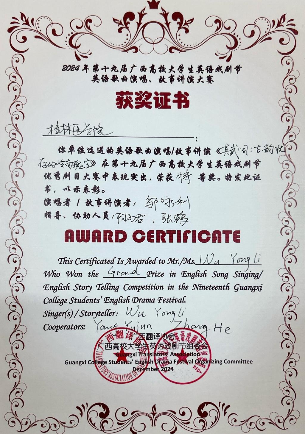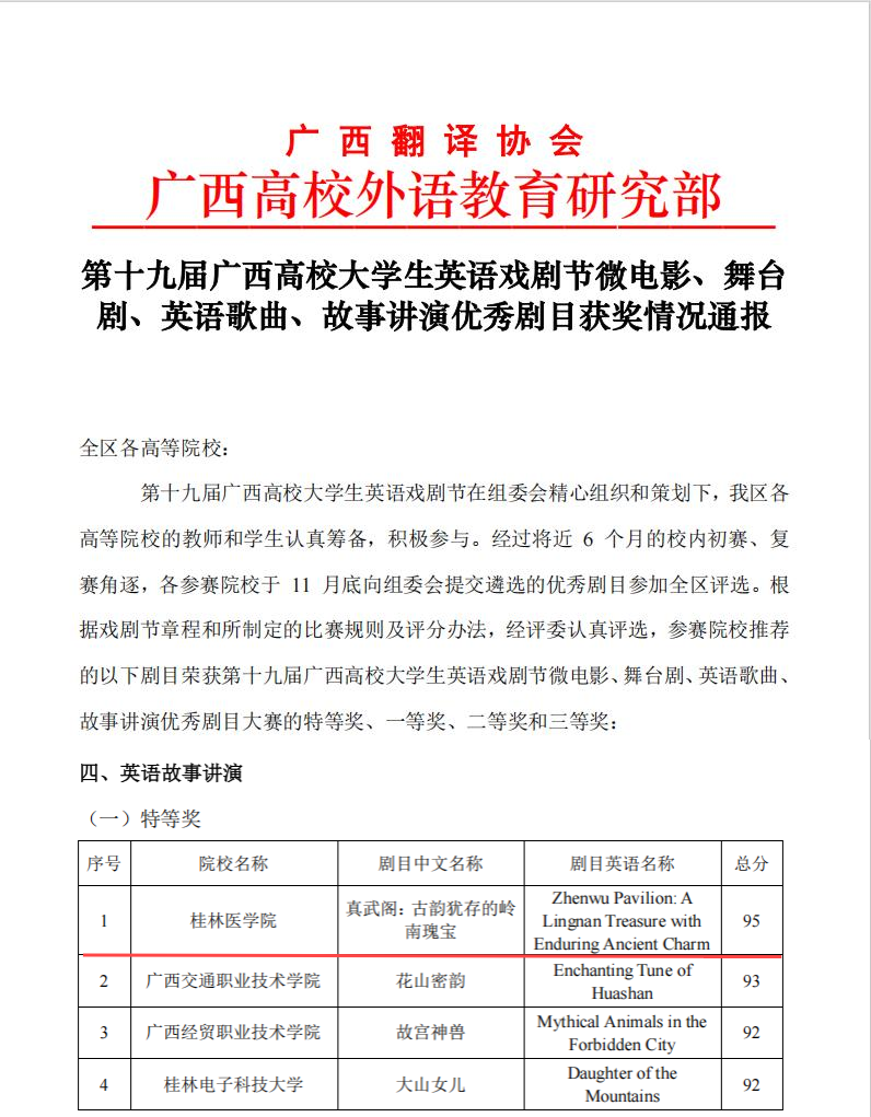 近日,第十九届广西高校大学生英语戏剧节公布获奖名单,我校选送的4件参赛作品在全区众多作品中脱颖而出,取得优异成绩。