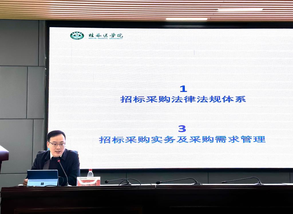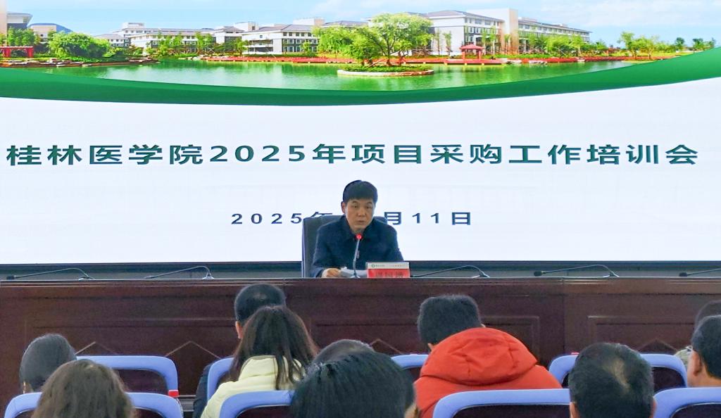 为规范采购流程、强化风险防控、提升管理效能,3月11日下午,我校在科学实验中心一楼报告厅召开2025年项目采购工作培训会。校党委常委、总会计师周国增,广西机电设备招标有限公司副总经理王晟及桂林分公司负责人栗晓奇,学校各经费归口管理部门负责人、二级学院及职能部门采购工作分管负责人、项目联系人等80余人参会。会议由国有资产管理处负责人主持。