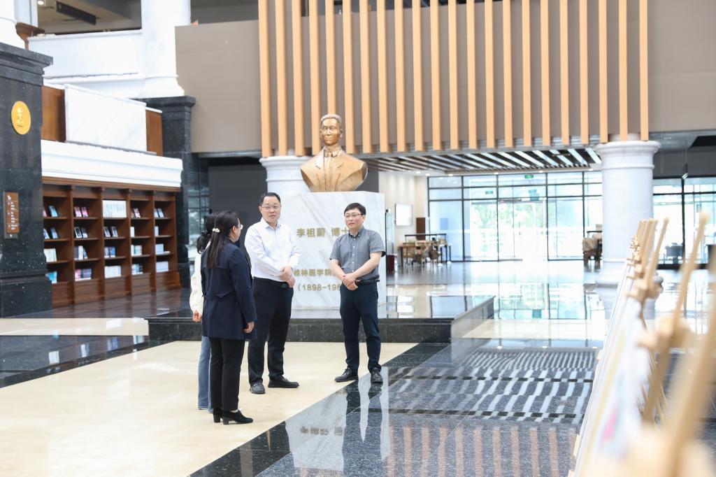 马献力详细了解了图书馆党支部开展深入贯彻中央八项规定精神学习教育情况,并就图书馆服务育人工作和文化内涵建设与图书馆负责同志进行了深入探讨。他指出,图书馆作为学校文化育人的主阵地,要充分发挥文化传承作用,以世界读书日为载体传播中华优秀传统文化,倡导广大师生养成多读书、爱读书的习惯,促进师生文明素养的提升。同时,坚持以党建引领业务发展,将作风建设融入到日常工作的每个环节,充分发挥图书馆服务育人与精神铸魂功能,积极开展社会教育、文化传播、阅读推广活动,为培养医学与人文融通的健康守护者贡献力量。