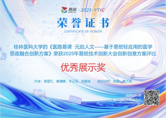 活动采用现场答辩形式对作品进行展示与评比,我校参赛作品《医路易课·元启人文——基于易班轻应用的医学思政融合创新方案》(作者:蒋章红、蒙珊娜、李云菲、梁嘉瑜 指导老师:高雷、葛文漪)在本次比赛中荣获创新创意类作品优秀展示奖。