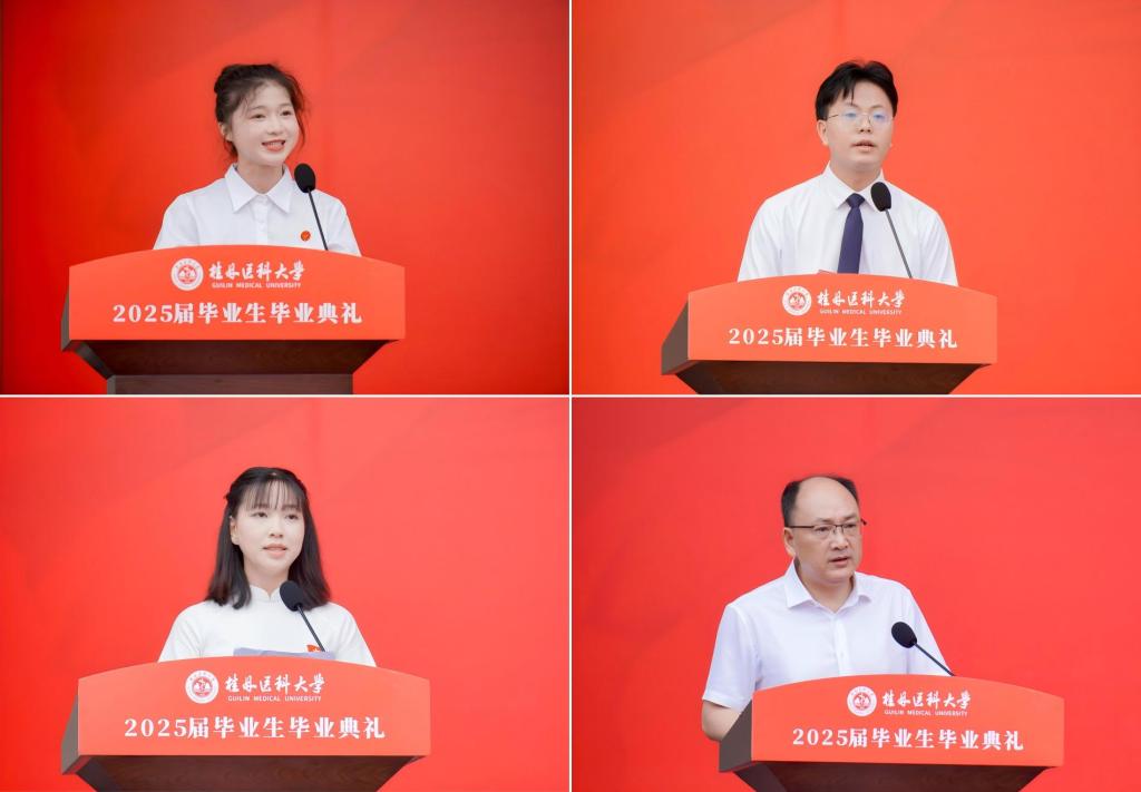 少年奋斗时,执笔亦执梦。毕业生代表依次发言,本科毕业生秦晴艳感恩母校的培养,表示将秉承“弘德善医”校训精神,踔厉奋发,砥砺前行;研究生代表姜树森感悟三年研究生生涯的成长与感动,表示将以青春之我、奋斗之我,为祖国的医疗卫生事业贡献力量;来自越南的留学生代表盘庆玄深情回顾在桂医求学的难忘时光,表示永葆求知探索的初心,用行动践行“健康所系,性命相托”的医学生誓言。毕业生家长代表孙煦勇衷心感谢学校的精心培养和老师们的辛苦付出,希望毕业生们学会感恩,终身学习,在未来人生路上继续奋斗。