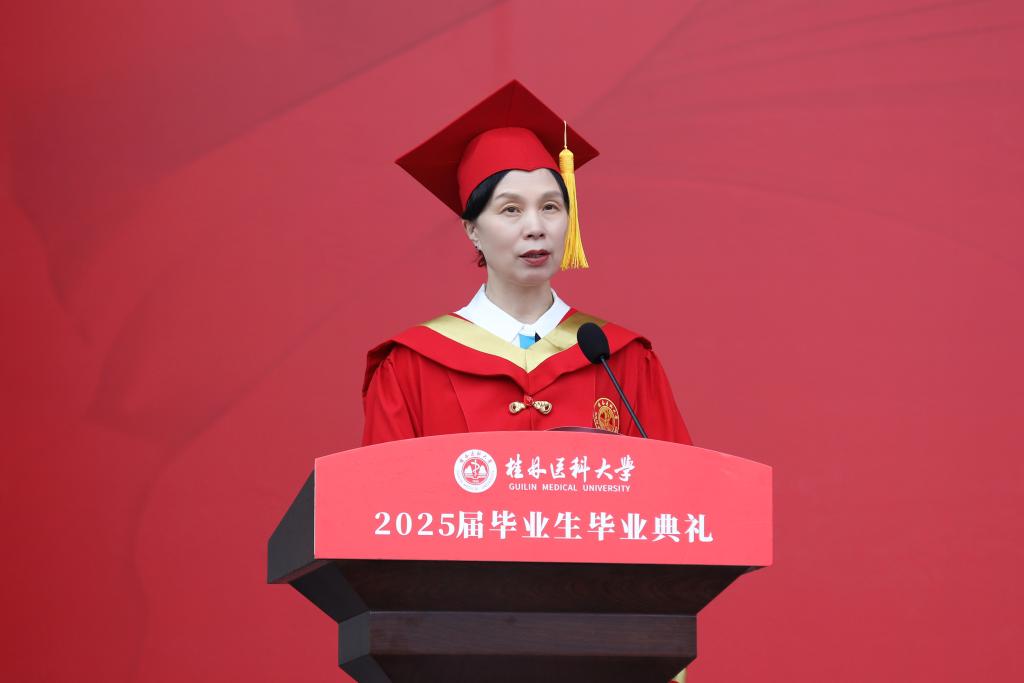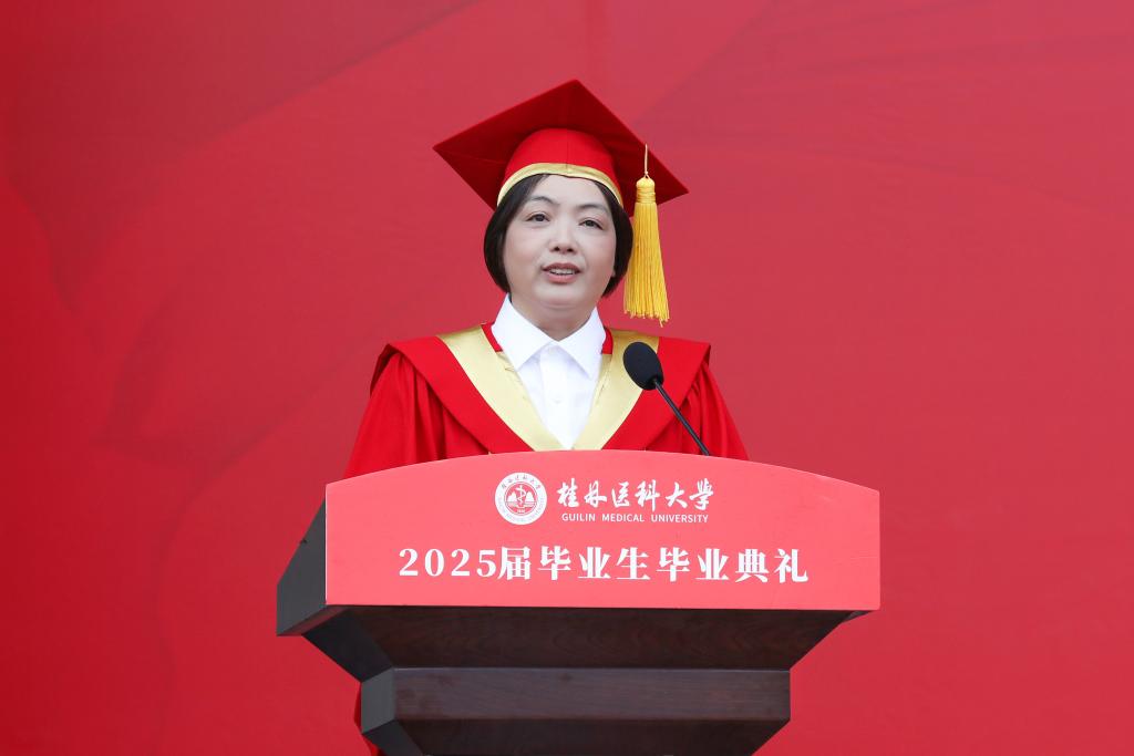 校长曾小云以“乘时代长风,筑医者荣光”为题,代表学校向全体首届桂林医科大学毕业生致以最热烈的祝贺。曾小云与毕业生们一起深情回顾在桂医的求学岁月,并寄语同学们:以硬核之姿,在大学更名新篇中镌刻华章;驭科技浪潮,在跨界融合中奋楫争先;承九秩荣光,在时代征程中续写传奇。她希望全体毕业生握紧时代赠予的舵轮和风帆,带着母校赋予的智慧与温度,在祖国乃至世界的广阔舞台上,无畏起航,把自己锻造成堪当民族复兴重任的时代青年,书写属于自己的荣光。