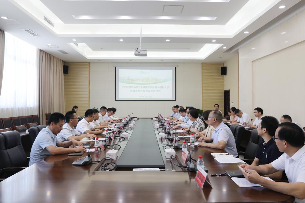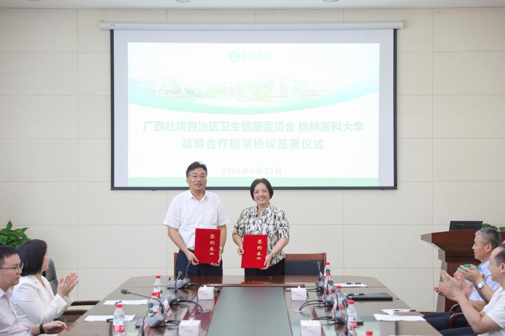 6月25日下午,我校与广西壮族自治区卫生健康委员会战略合作框架协议签署仪式在临桂校区举行。自治区卫生健康委党组书记、主任杜振宗,桂林市卫生健康委党组书记、主任戴波,学校党委书记马献力、校长曾小云、副校长陈健、校长助理莫碧文出席签署仪式。自治区卫生健康委和学校相关职能部门、二级学院及人工智能与大健康发展研究院相关负责人参加仪式。仪式由曾小云主持。