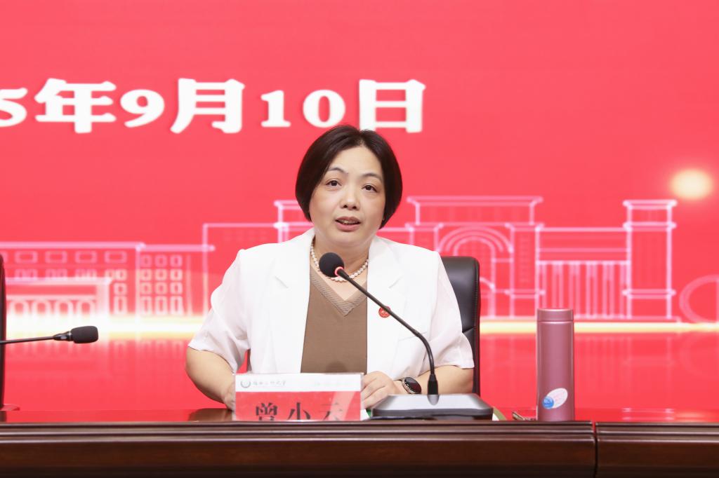 曾小云在主持讲话中表示,教师是立教之本、兴教之源。学校高度重视教师队伍建设,不断完善教师培养、引进和激励机制,为教师的成长和发展搭建平台。学校各部门要进一步营造尊师重教的浓厚氛围,持续加强高水平教师队伍建设,进一步办好人民满意的教育,以实干作风打开学校发展新局面。她希望全校教职员工以今天受表彰的先进典型为榜样,深刻认识高等教育在加快建设教育强国、科技强国、人才强国中肩负的龙头担当和历史责任,践行教育家精神,坚守初心、勇担使命,争做党和人民满意的“四有”好老师,以更加昂扬的姿态,乘势而上,谱写桂林医科大学建设发展新篇章,为建设教育强国作出新的更大贡献。