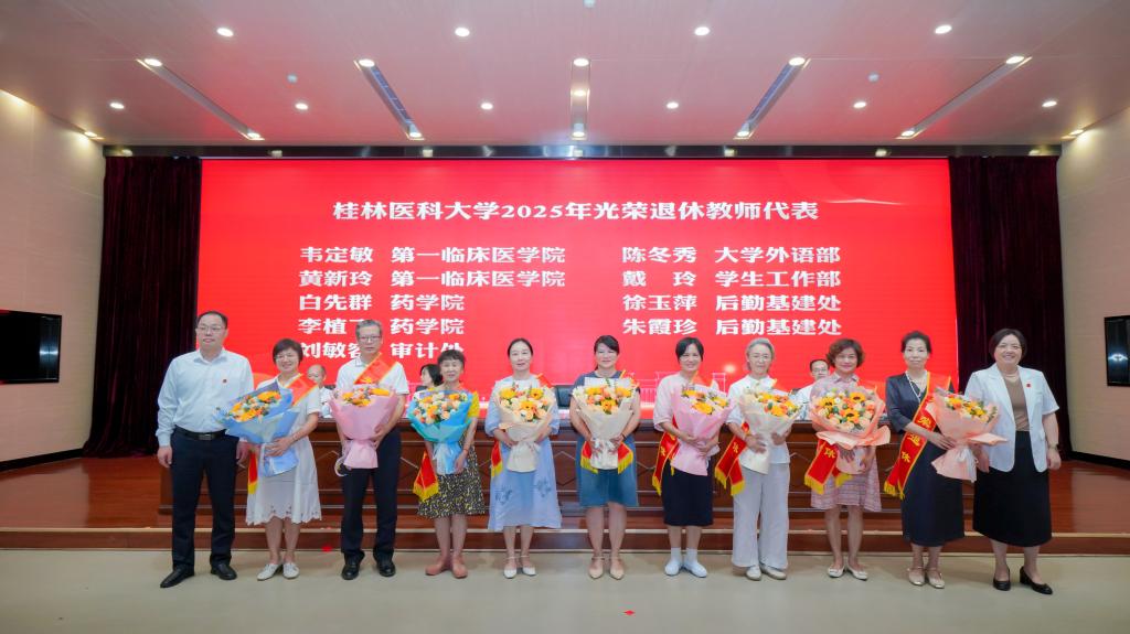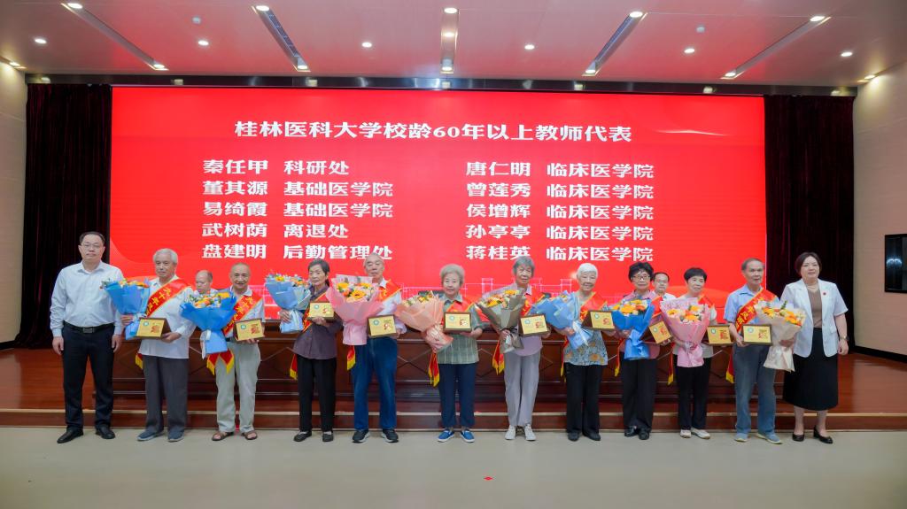 桃李满天下,春晖遍四方。马献力、曾小云为今年光荣退休的教师代表送上鲜花和祝福,并为校龄60年以上的教师代表颁发“桂医建设纪念章”,感谢他们为学校改革发展付出心血和汗水。他们见证了学校发展的光辉历程,他们的精神也将激励全体教职工继续勇毅前行。