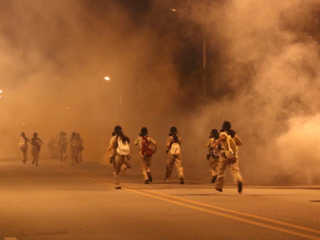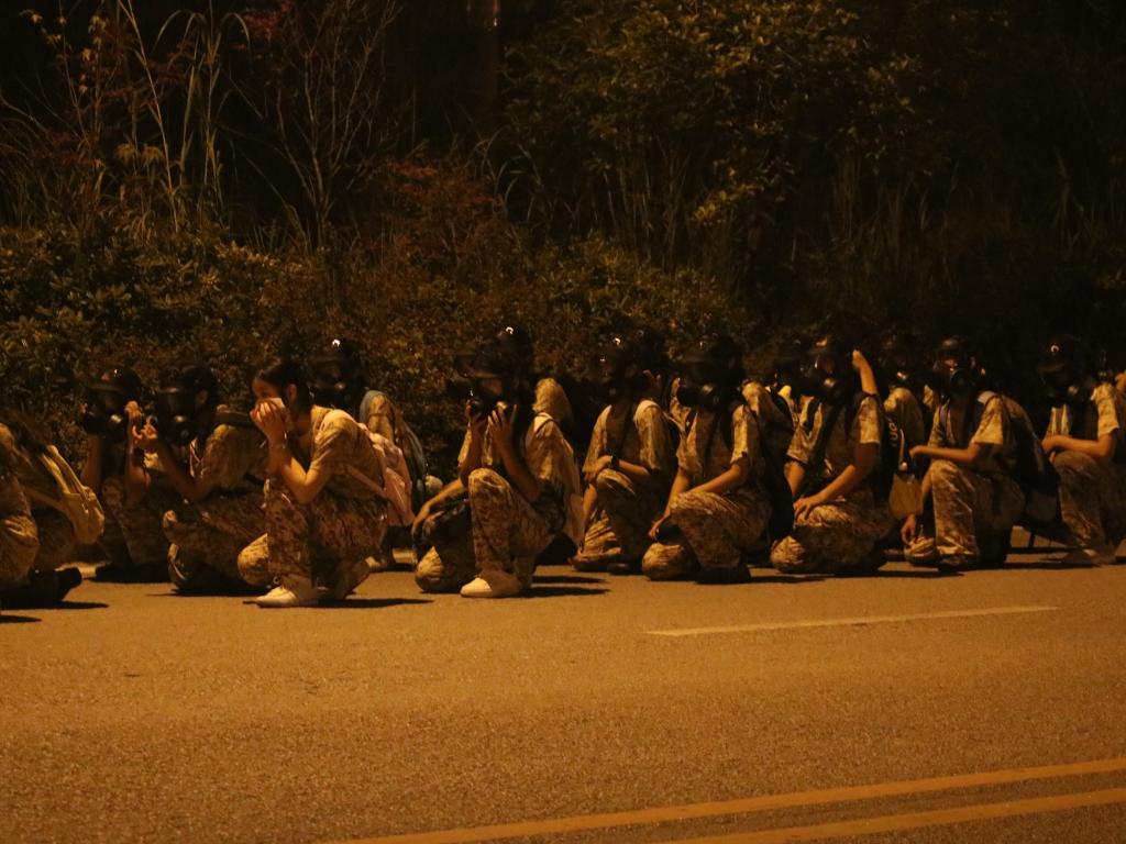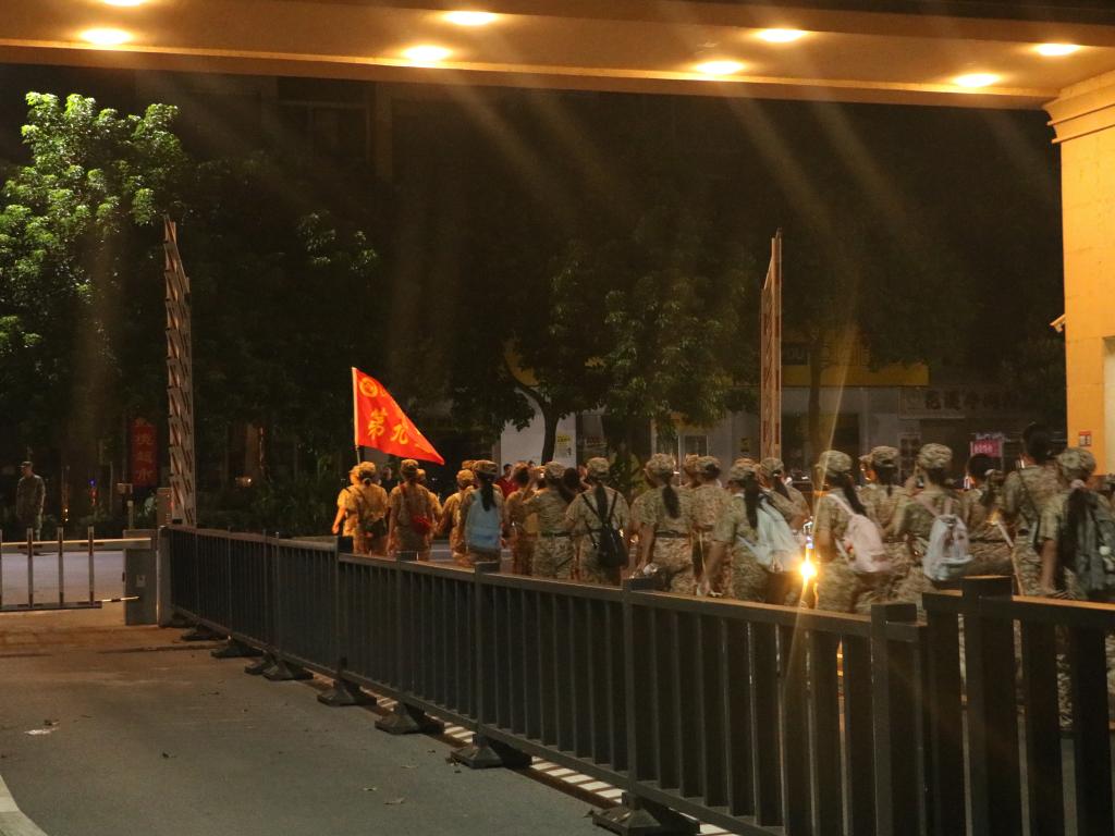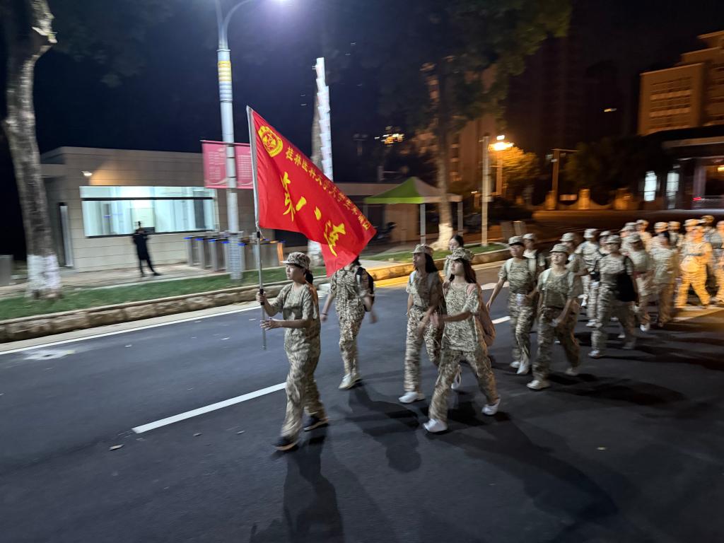 紧急集合的哨声在零点划破校园的宁静,军训团在学校北田径场集结出发,各连分两路纵队依次从东门、北门出校园,途径致远路、人民路、西城大道、飞虎路、广福路、瑞宁路等道路,全程行军约15公里,4000余名学生在拉练途中分别进行了遇敌袭扰、通过染毒区、防空袭等课目训练,四点安全返回学校。行军全程配备有救护车、安全保障车、交通车、警车等进行保障,应对突发状况。