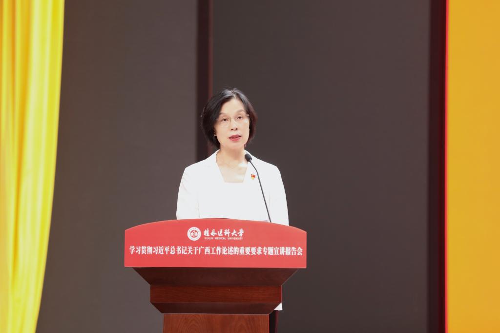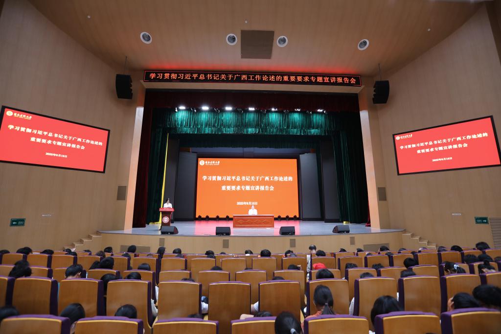 为深入学习宣传贯彻习近平总书记关于广西工作论述的重要要求,推动党的创新理论有效触达青年群体,根据自治区党委宣传部《理论宣讲青年群体全覆盖三年行动计划工作方案》安排,9月16日,我校举行学习贯彻习近平总书记关于广西工作论述的重要要求专题宣讲报告会。学校党委书记马献力作题为《凝心聚力建设新时代壮美广西》的专题宣讲报告。学校党委副书记陈旭主持报告会。