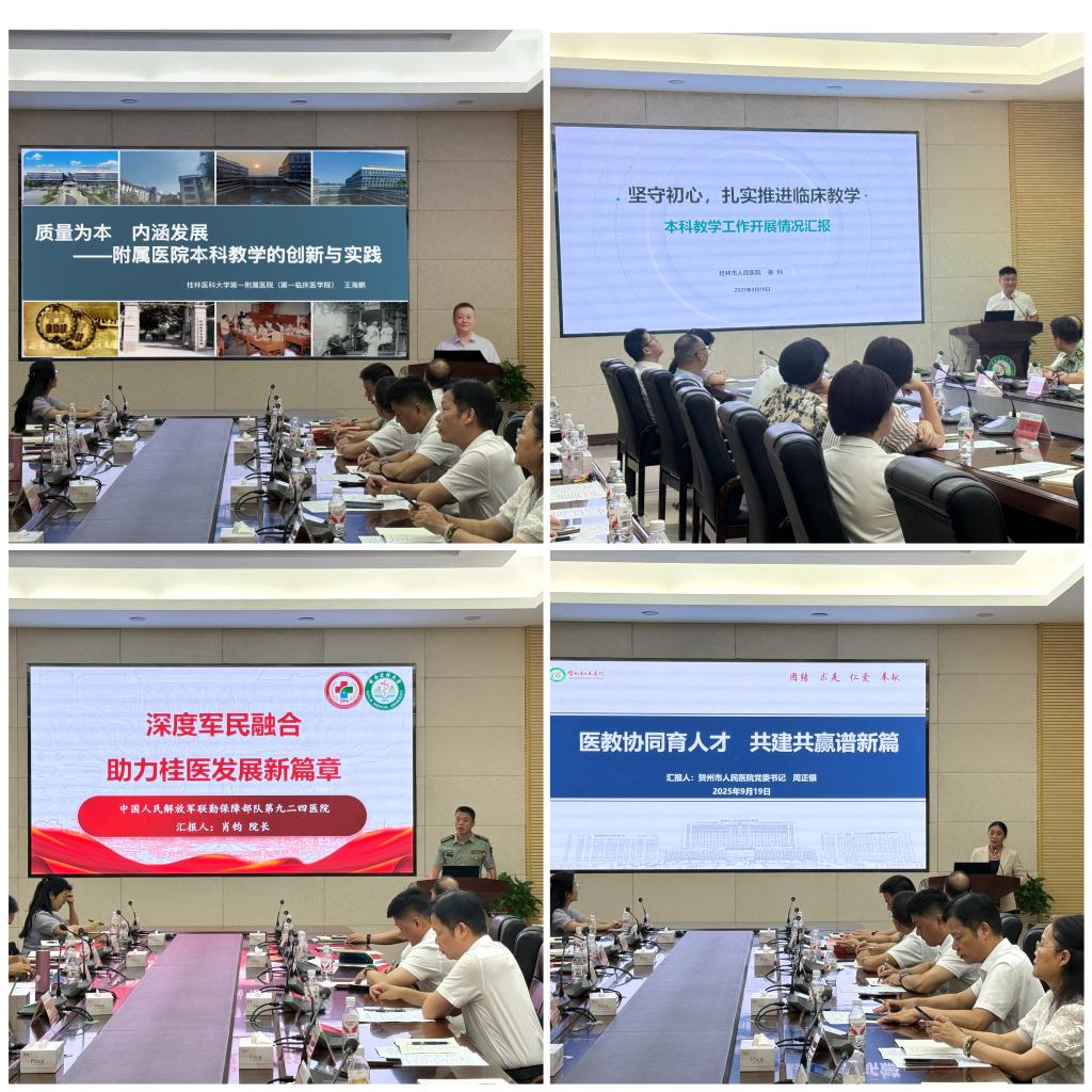 在经验分享环节,第一附属医院分管教学负责人以《质量为本,内涵发展——附属医院本科教学的创新与实践》为题,分享了该院在深化教学改革、保障教学质量、培育卓越医学人才方面的创新举措与实践成果。附属桂林市人民医院负责人以《坚守初心,扎实推进临床教学》为主题,展示了医院在巩固临床教学主体地位、完善教学管理体系和加强师资队伍建设方面的经验。附属第九二四医院负责人围绕《深度军民融合,谱写桂医发展新篇章》,介绍了将军事医学特色融入大学人才培养与学科建设的有效路径,拓展了校院合作新领域。附属贺州医院负责人以《医教协同育人才,共建共赢谱新篇》为题,分享了医院在协同育人、共建共赢方面的积极探索与显著成效。