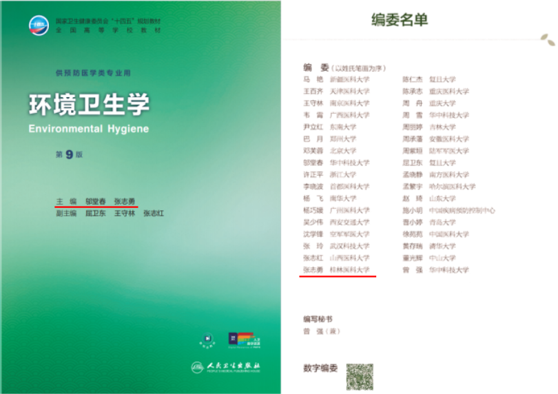 近日,由中国工程院院士邬堂春教授与我校张志勇教授共同主编,国内30余所高校知名专家参编的国家级规划教材《环境卫生学》(第九版)由人民卫生出版社正式出版。该教材入选国家卫生健康委员会“十四五”规划教材,并作为全国高等学校预防医学专业第九轮核心教材使用。此次是我校首次担任该类国家级规划教材的主编单位,标志着学校在教材建设领域取得重大突破,也为建校九十周年献上了一份厚礼。