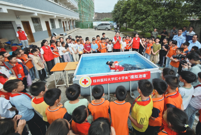 在桂林市永福县罗锦小学,桂林医科大学的志愿者通过场景模拟、演练实操等形式,为小学师生带来了一堂生动而深刻的青少年防溺水生命教育课。该项目已在溺水高发、频发地区的中小学、社区、村屯开展560余场次,8万余名青少年从中获益。2024年,“模拟池塘——场景式青少年防溺水生命教育项目”,荣获首届全国红十字志愿服务项目大赛金奖、第七届中国青年志愿服务项目大赛金奖。