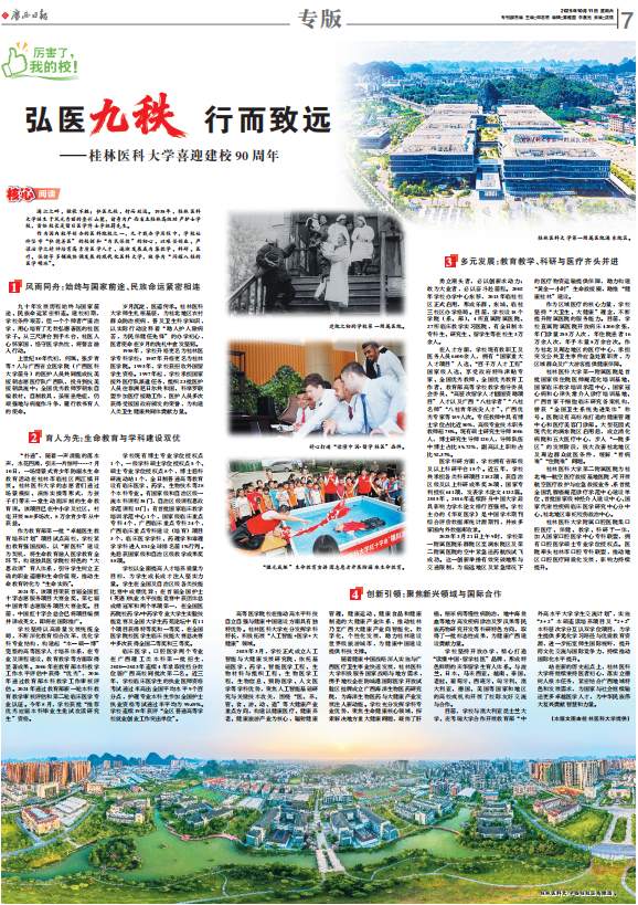 作为国内较早创办的医科院校之一,九十载办学历程中,学校始终坚守“弘德善医”的校训和“为民保健”的初心,以艰苦创业、严谨治学之精神培育高素质医学人才,逐渐发展成为集教学、科研、医疗、保健等多领域协调发展的现代化医科大学,被誉为“闪耀八桂的医学明珠”。