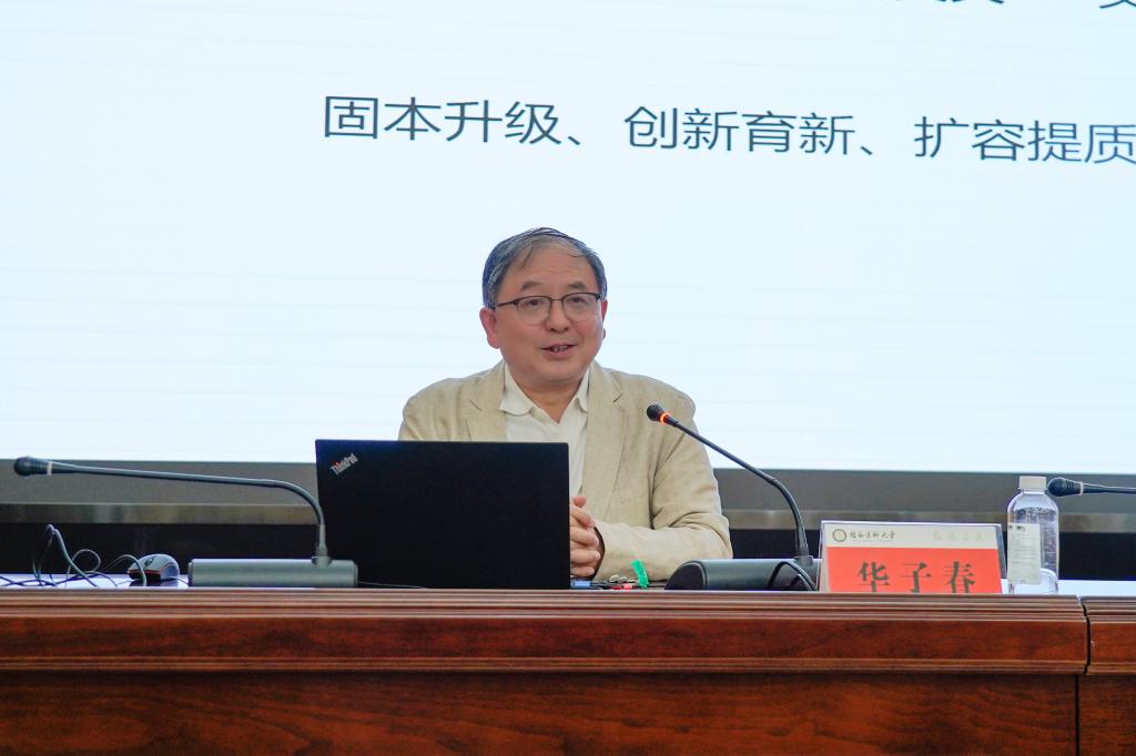 华子春教授的专题报告以践行“五结合”理念,构建医药融合新生态——地方医科大学医药学科高质量发展的战略与实践为主题,从科技体系建设改革、实验室平台人才培育、学科交叉融合等角度进行深入浅出地分析。他重点分享了“和前沿、政府、临床、产业、校情相结合”的“五结合”思路,医药科学研究出发点应来自临床并回归临床应用,推动人工智能技术与各学科交叉融合等科研产业经验。