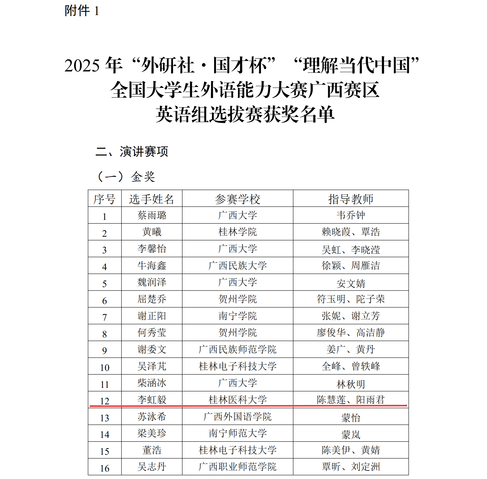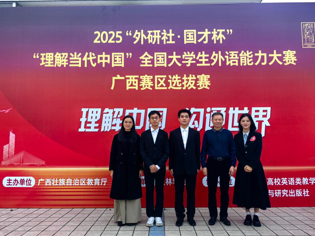 近日,2025“外研社・国才杯”“理解当代中国” 全国大学生外语能力大赛广西赛区选拔赛结果揭晓。本次赛事吸引全区38所高校597名选手同台竞技,我校学子凭借扎实功底与出色表现,在演讲、短视频及综合能力赛项中斩获1金3银1铜的优异成绩。