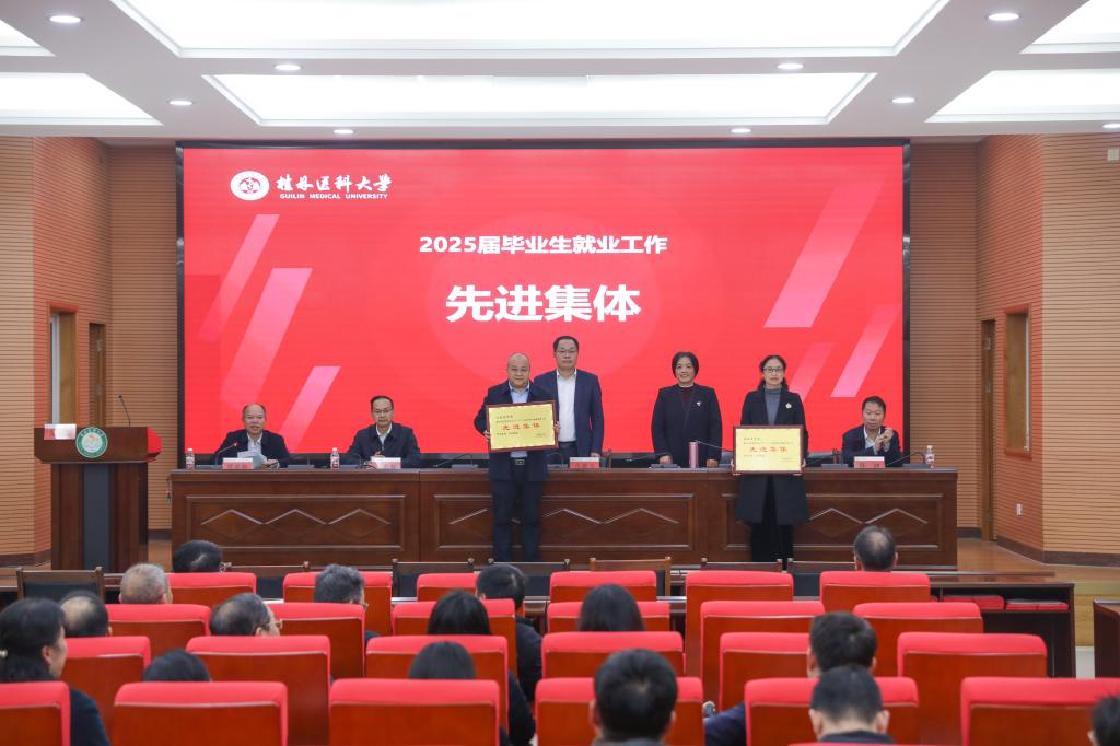覃克强宣读了2025届毕业生就业创业工作先进集体及先进个人表彰文件。校领导为获奖集体与个人颁奖,并向新入选的“征兵宣讲团志愿者”颁发聘书。学院与个人代表分别作经验交流发言。