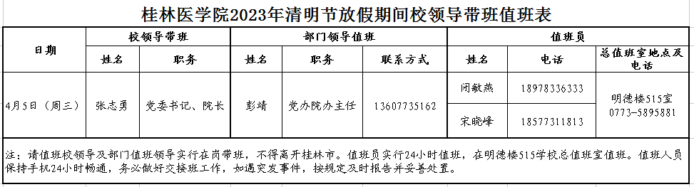 桂林医学院2023年清明节放假期间校领导带班值班表