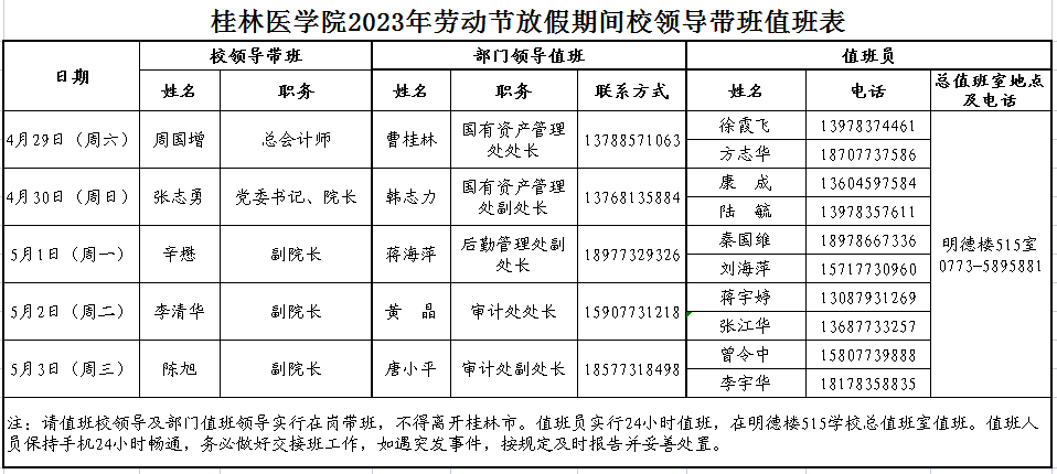桂林医学院2023年劳动节放假期间校领导带班值班表