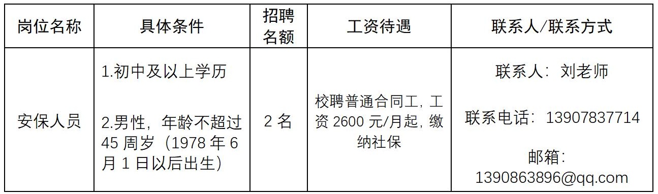 因工作需要,现面向社会公开招聘临桂校区安保人员2名。现就有关事项公告如下: