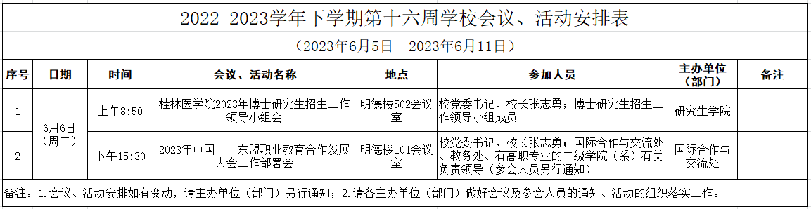 2022-2023学年下学期第十六周学校会议、活动安排表(2023年6月5日—2023年6月11日)