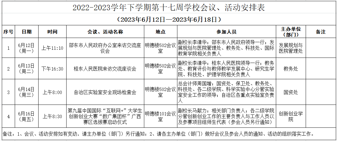 2022-2023学年下学期第十七周学校会议、活动安排表(2023年6月12日—2023年6月18日)