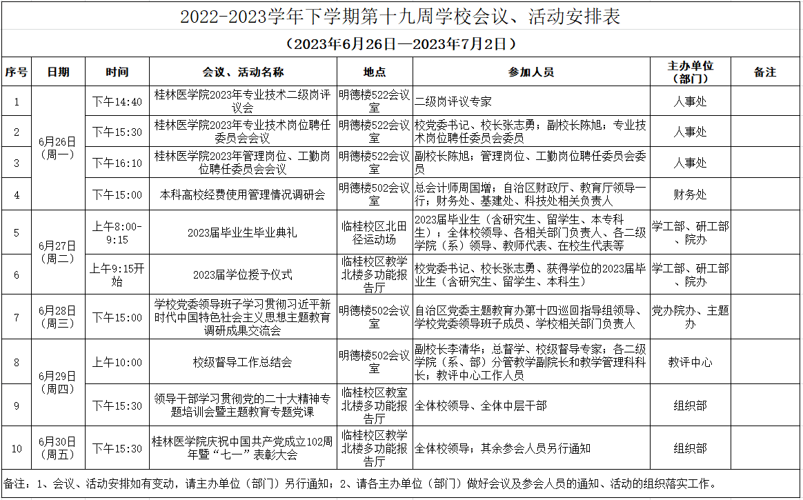 2022-2023学年下学期第十九周学校会议、活动安排表(2023年6月26日—2023年7月2日)