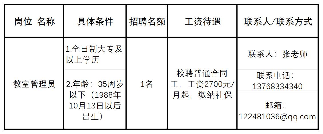 因工作需要,现面向社会招聘临桂校区教室管理员1名。现就有关事项公告如下: