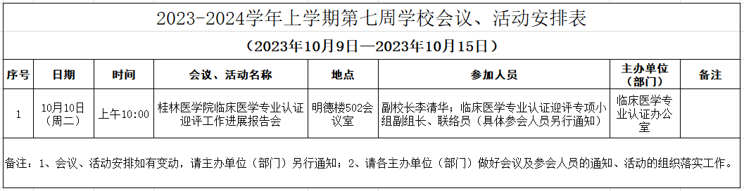 2023-2024学年上学期第七周学校会议、活动安排表(2023年10月9日—2023年10月15日)