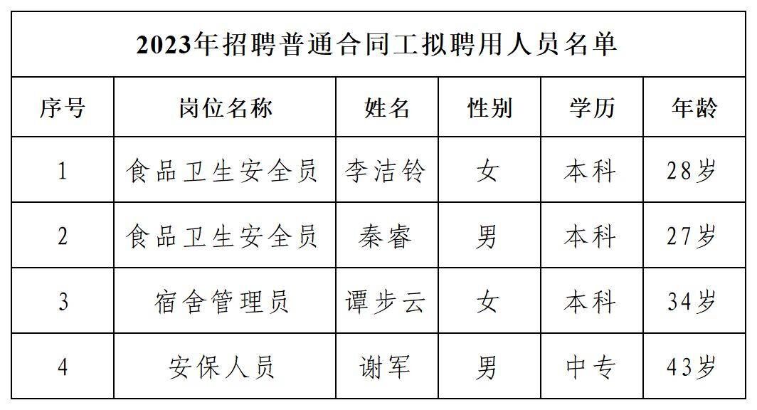 根据《桂林医学院2023年招聘食品卫生安全员、宿舍管理员、安保人员公告》的有关安排和规定,经资格审查、考核、政审和体检后,拟聘用李洁铃、秦睿、谭步云、谢军到相应岗位工作,现将拟聘用人员基本情况予以公示,公示期7天(2023年10月18日至10月24日)。