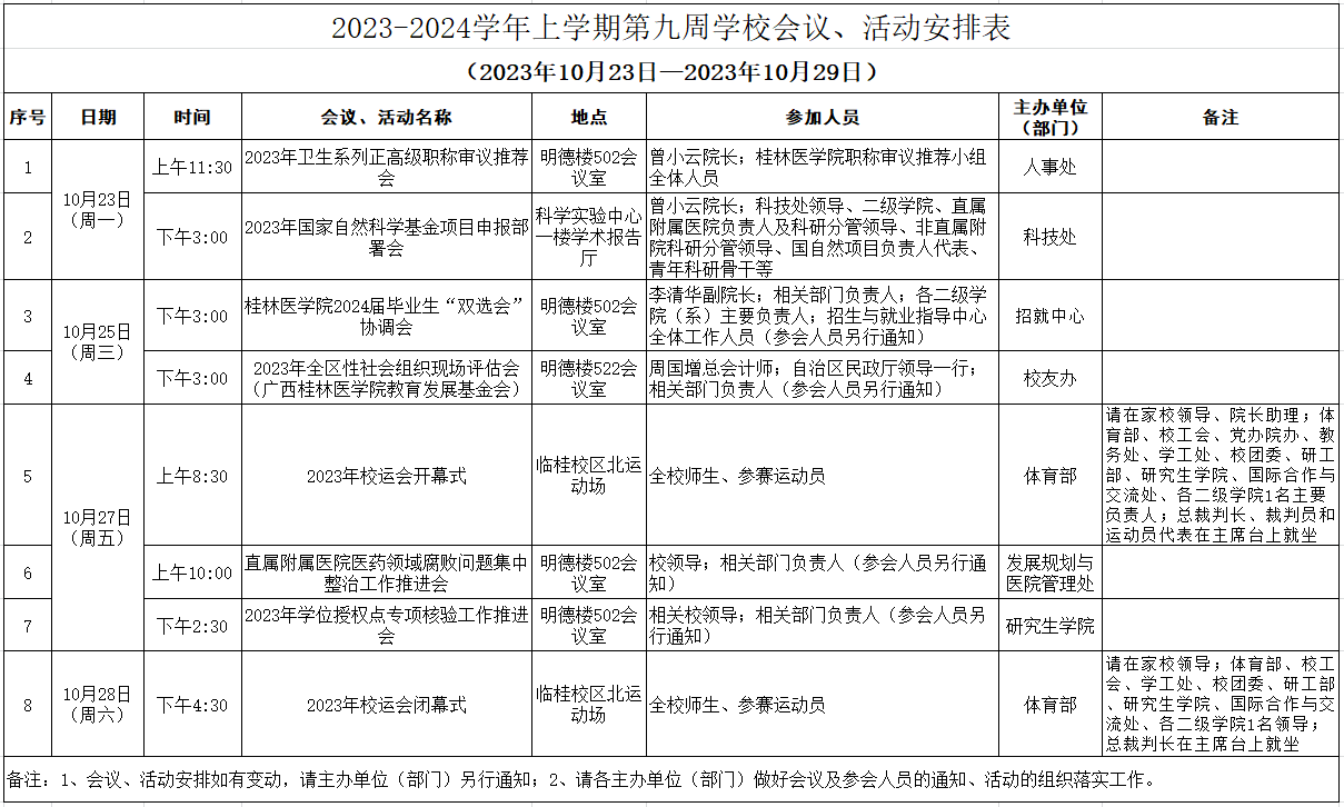 2023-2024学年上学期第九周学校会议、活动安排表(2023年10月23日—2023年10月29日)