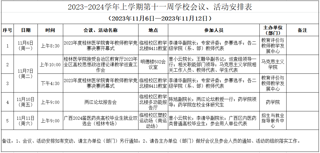 2023-2024学年上学期第十一周学校会议、活动安排表(2023年11月6日—2023年11月12日)