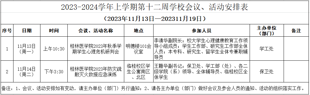 2023-2024学年上学期第十二周学校会议、活动安排表(2023年11月13日—2023年11月19日)