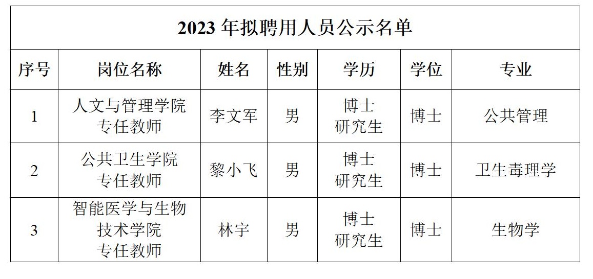 根据桂林医学院2023年招聘计划,经资格审查、考核、政审和体检,拟聘用李文军、黎小飞、林宇到相应岗位,现将拟聘用人员基本情况予以公示,公示期7天。