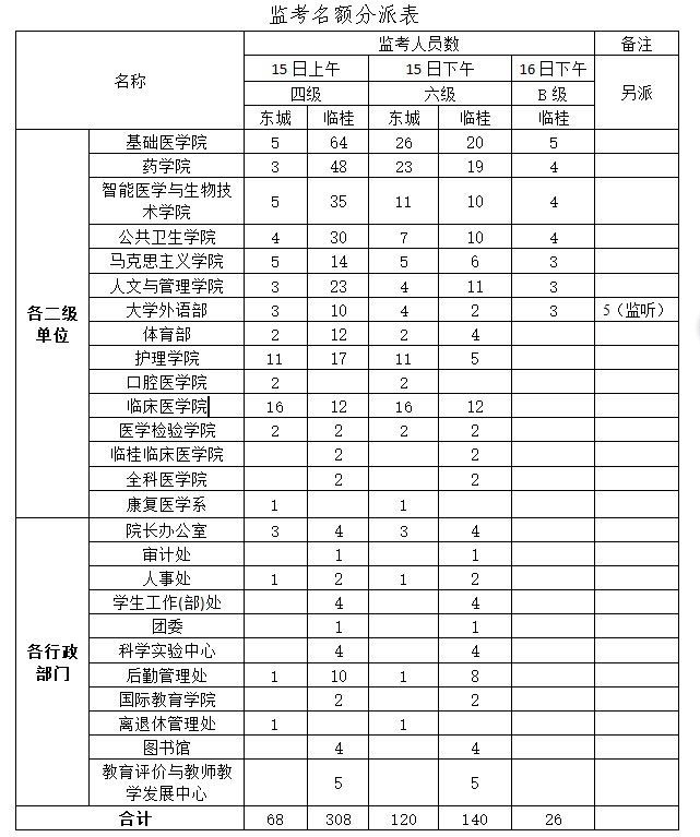2024年上半年大学英语等级考试将于6月15-16日举行,为使考试工作顺利进行,请校直各单位、各部门高度重视,按照“监考名额分派表”做好监考人员的选派工作,现将有关事项通知如下: