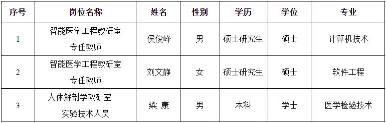 根据桂林医学院2024年招聘计划,经资格审查、考试、政审和体检,拟聘用侯俊峰、刘文静、梁康到相应岗位,现将拟聘用人员基本情况予以公示,公示期7个工作日(2024年5月11日至2024年5月20日)。